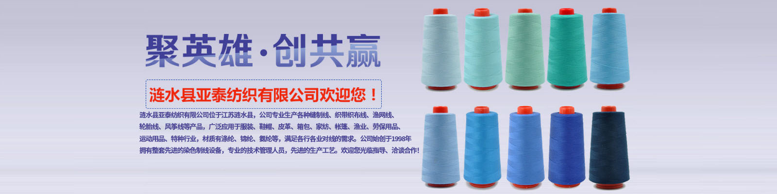 漣水縣亞泰紡織有限公司位于江蘇漣水縣,公司專業(yè)生產(chǎn)各種縫制線、織帶織布線、漁網(wǎng)線、輪胎線、風(fēng)箏線等產(chǎn)品,廣泛應(yīng)用于服裝、鞋帽、皮革、箱包、家紡、帳篷、漁業(yè)、勞保用品、運動用品、特種行業(yè),材質(zhì)有滌綸、錦綸、氨綸等,滿足各行各業(yè)對線的需求。公司始創(chuàng)于1998年,擁有整套先進的染色制線設(shè)備,專業(yè)的技術(shù)管理人員,先進的生產(chǎn)工藝。歡迎您光臨指導(dǎo)、洽談合作!